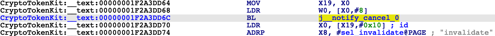 IDA was able to map our database (including CryptoTokenKit, libobjc, and the satellite __auth_stubs sections) into process memory. We can single step, resume, inspect registers, and perform any other operation that is typical of an IDA debugging session.