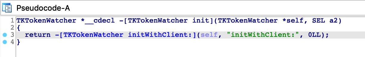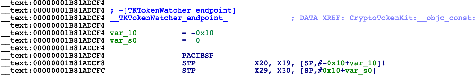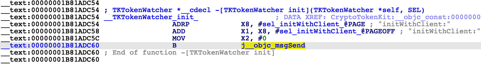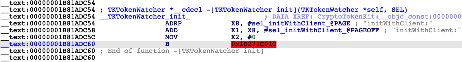 This is a common pattern in the latest arm64e dyldcaches, and it is quite convenient for us. Loading a handful of __auth_stubs sections is enough to resolve most of the calls in CryptoTokenKit, which gives us some nice analysis for -[TKTokenWatcher init] and its helper method: