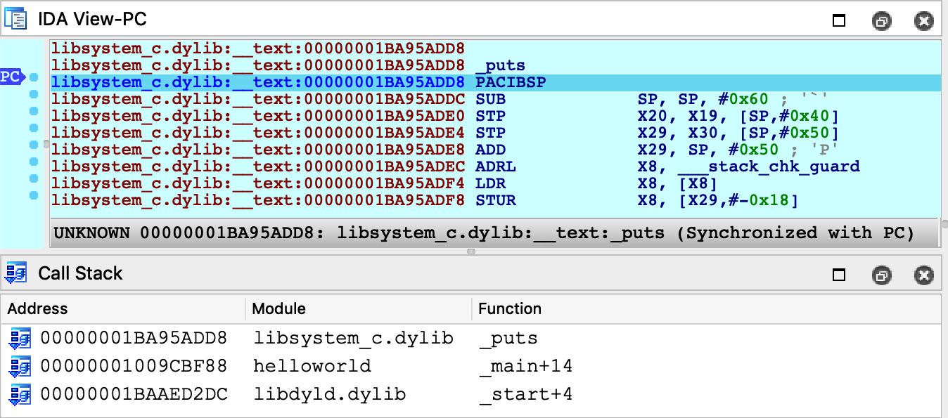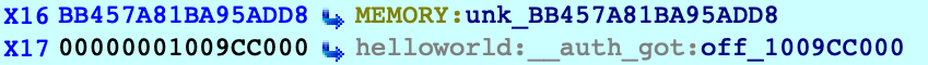 The stub reads a value from off_109CC000, then performs a branch with pointer authentication. We can assume that at some point, dyld will fill off_109CC000 with an authenticated pointer to puts. Let's use IDA to quickly track down this logic in dyld.