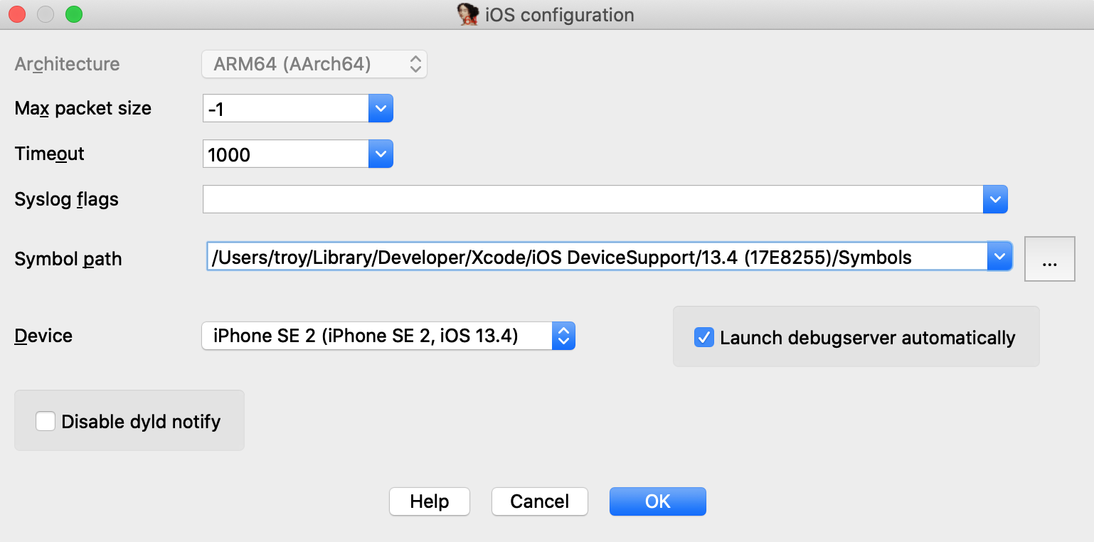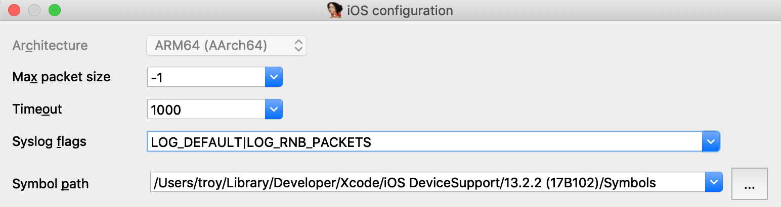 Make special note of the Symbol path option. This directory contains symbol files extracted from your device. Both IDA and Xcode use these files to load symbol tables for system libraries during debugging (instead of reading the tables in process memory), which will dramatically speed up debugging.