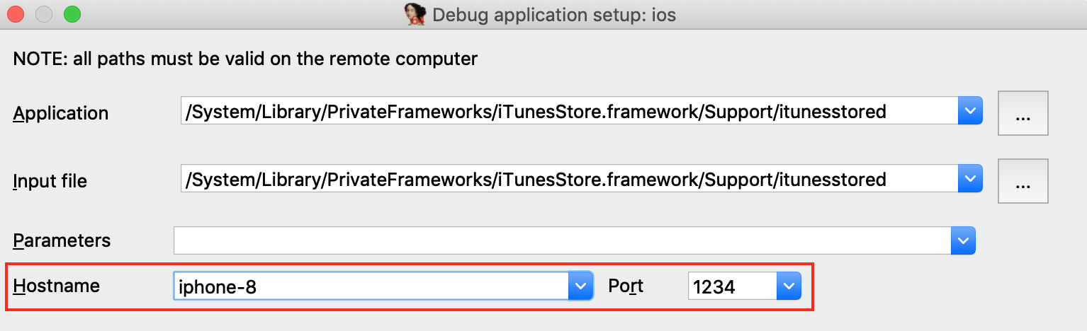 Since we set AUTOLAUNCH = NO, IDA now provides the Hostname and Port fields so we can specify how to connect to our patched debugserver instance.