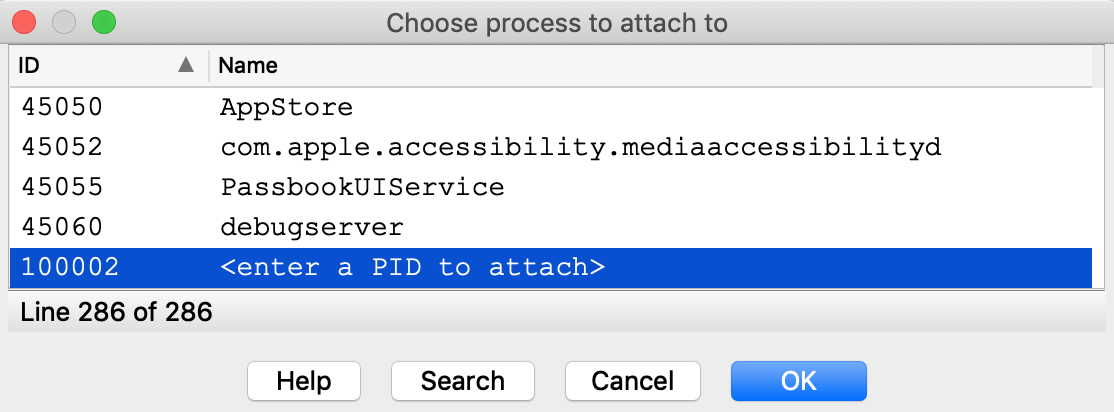 Note that although we're not using the debugserver from DeveloperDiskImage.dmg, IDA still depends on other developer tools to query the process list. We discuss how to install the DeveloperDiskImage in the Getting Started section above, but for a quick workaround you can always just specify the PID manually: