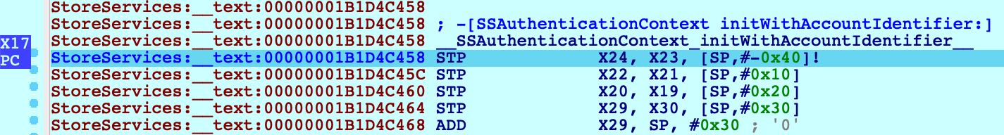 Now that we've successfully attached to a system process, let's do something interesting with it. Consider the method -[PurchaseOperation initWithPurchase:]. This logic seems to be invoked when a transaction is performed in the AppStore. Set a breakpoint at this method, then open the AppStore on your device and try downloading an app (it can be any app, even a free one).