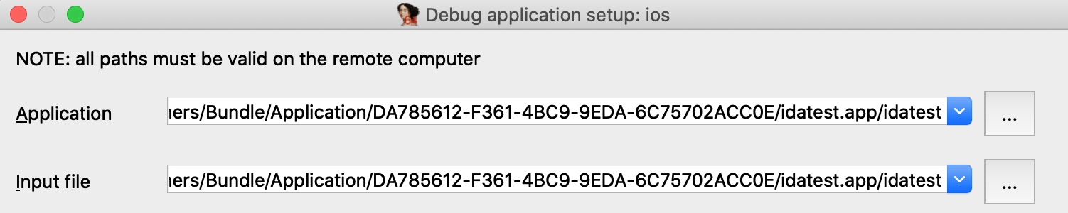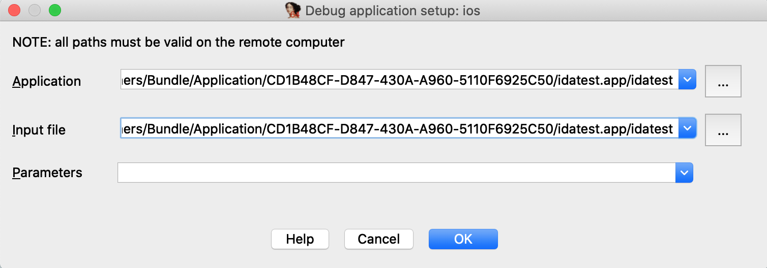 NOTE: the path contains a hex string representing the application's 16-byte UUID. This id is regenerated every time you reinstall the app, so you must update the path in IDA whenever the app is updated on the device.