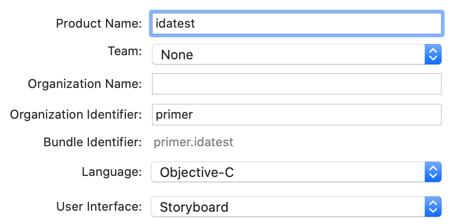 Note the bundle identifier primer.idatest, it will be important later. For the Team option choose the team associated with your iOS Developer account, and click OK. Before building be sure to set the target device in the top left of the Xcode window: