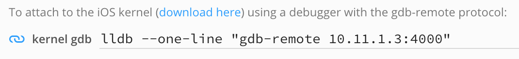 bash $ mkdir ~/iPhoneKDK2. copy the kernelcache from the virtual device:bash $ scp root@ip:/System/Library/Caches/com.apple.kernelcaches/kernelcache /tmp3. uncompress the kernelcache with lzssdec:bash $ lzssdec -o OFF < /tmp/kernelcache > ~/iPhoneKDK/kernelcache4. set KDK_PATH in dbg_xnu.cfg:c KDK_PATH = "~/iPhoneKDK";
