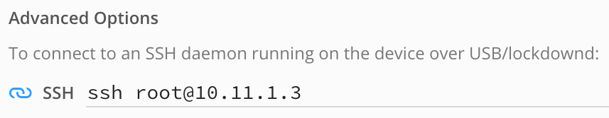 To get started with debugging iOS, we will perform a simple experiment to patch kernel memory. The device used in this example is a virtual iPhone XS with iOS 12.1.4, but it should work with any model or iOS version that Corellium supports. Begin by powering on your device and allow it to boot up. In the Corellium UI, look for the line labeled SSH under Advanced options: