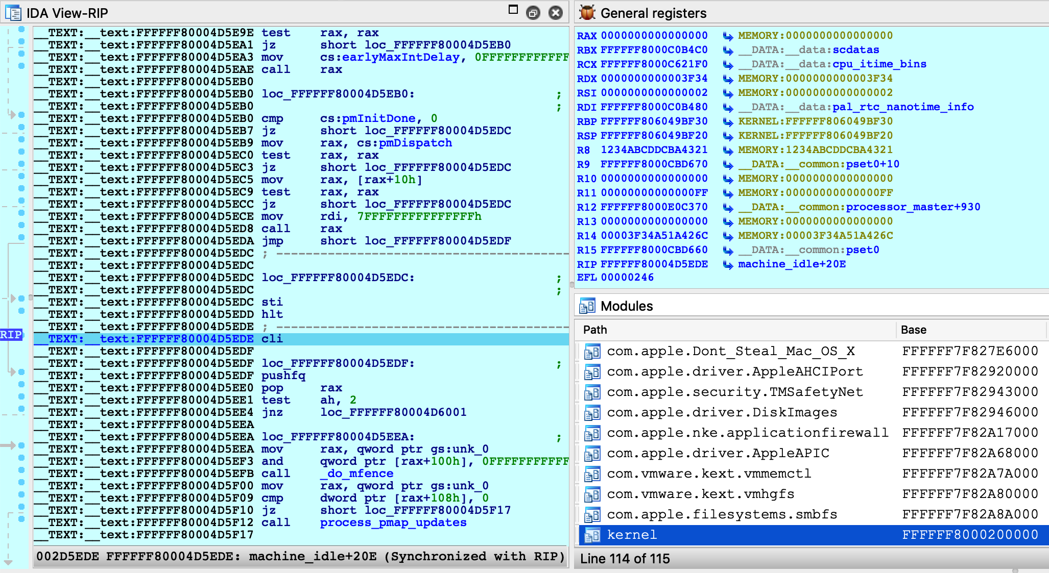 This signifies that IDA successfully detected the kernel base and created a new module in the Modules list. If the kernel has a symbol table, debug names will be available. Also note that PC now points inside the segment __TEXT_EXEC:__text instead of MEMORY, because the debugger parsed the kernel's load commands to generate proper debug segments.