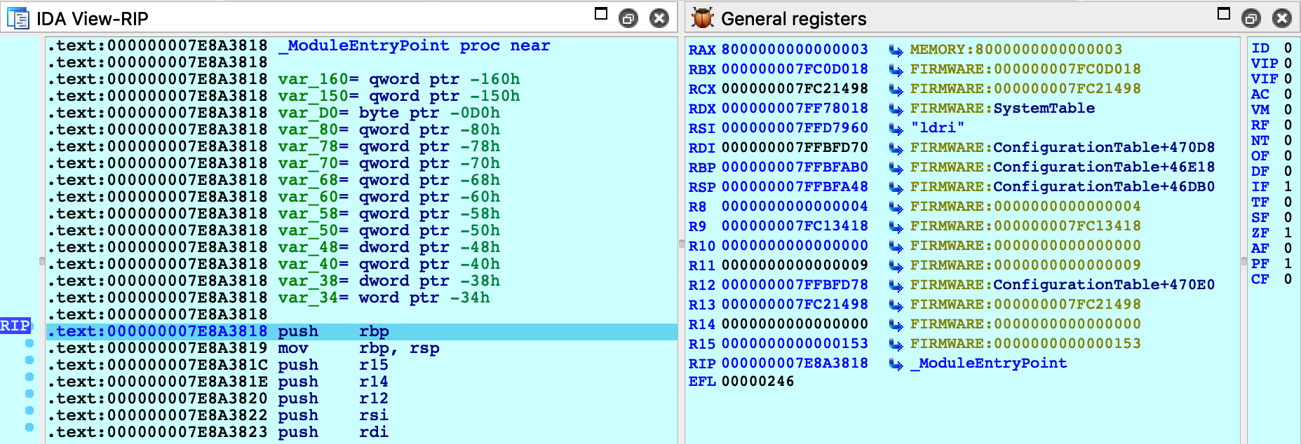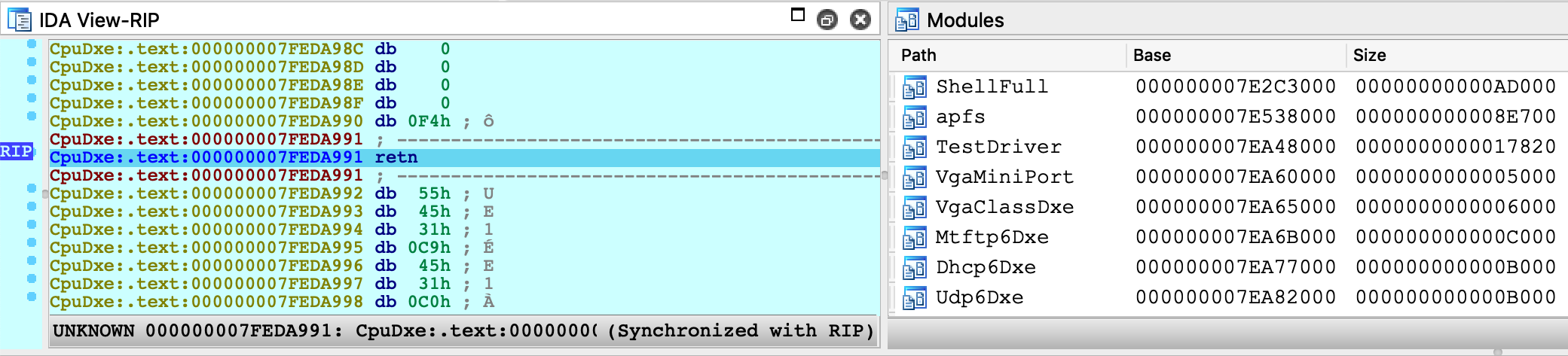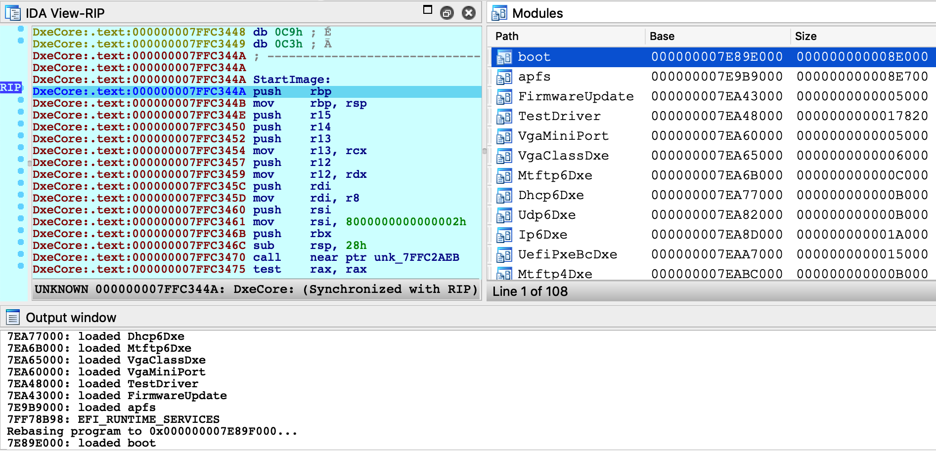 python idaapi.add_path_mapping("/Users/vmuser/TestApp", "/Users/hostuser/TestApp")8. Reboot the VM and enter the EFI Shell 9. Attach the debugger. After attaching IDA will detect the firmware images that have already been loaded: