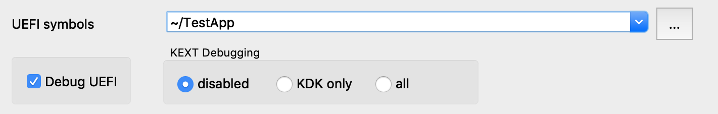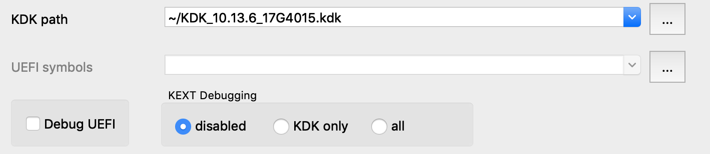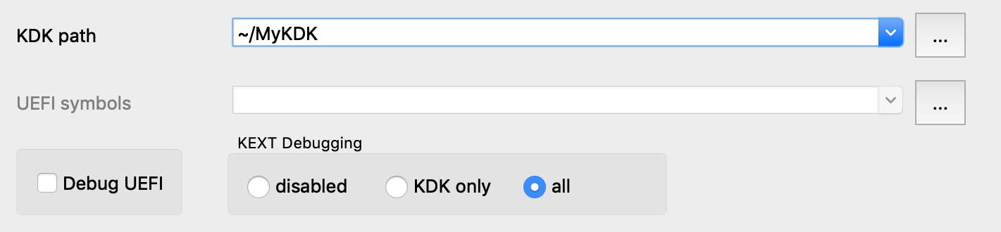 Also note that loading all kexts in kernel memory can be a slow operation, which is why it is disabled by default. Open Debugger>Debugger options>Set specific options and ensure the KDK path field is set, then set the KEXT Debugging option to KDK only:
