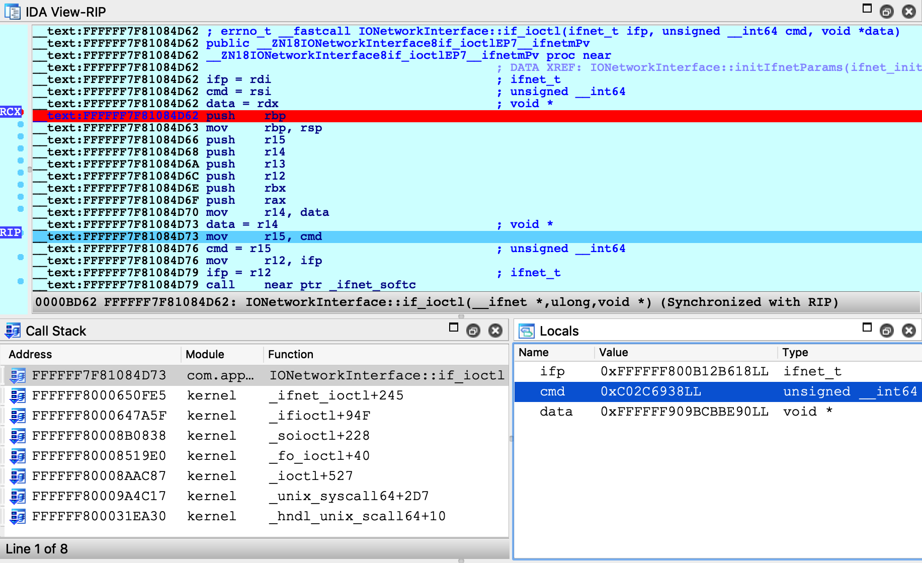 IDA supports source-level debugging for the XNU Kernel. However for demonstration purposes we will focus on assembly-level debugging, while taking advantage of source-level DWARF information like local variables. This is a bit more stable, and is still quite useful.