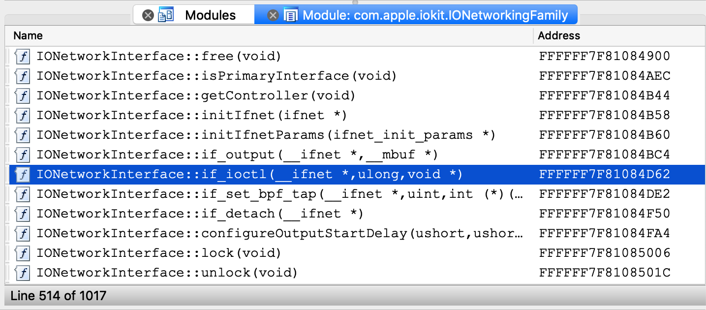 $ ida64 -onet.i64 $KEXTS/IONetworkingFamily.kext/Contents/MacOS/IONetworkingFamily