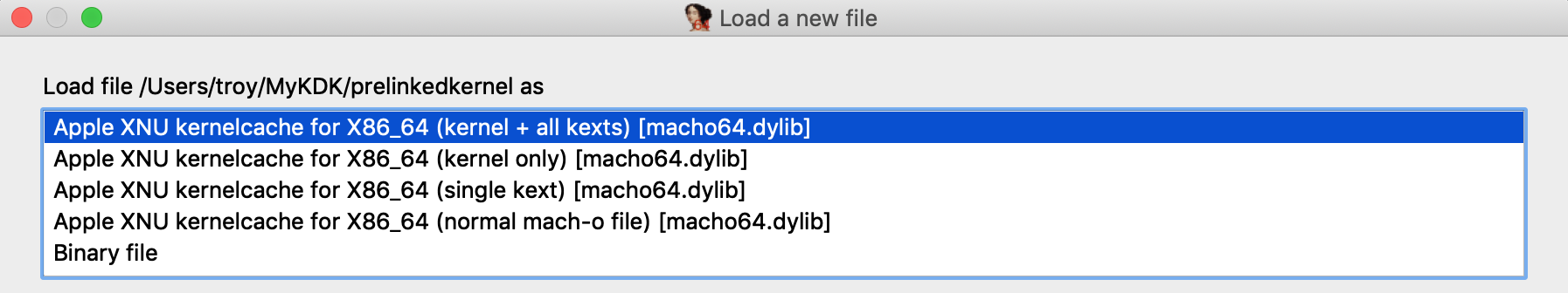 - Load DWARF for a prelinked KEXT: This action is useful if you have DWARF info for a prelinked kext that is not included in Apple's KDK. For a given DWARF file, the action will find a matching kext in the database and apply the DWARF info to this subfile.