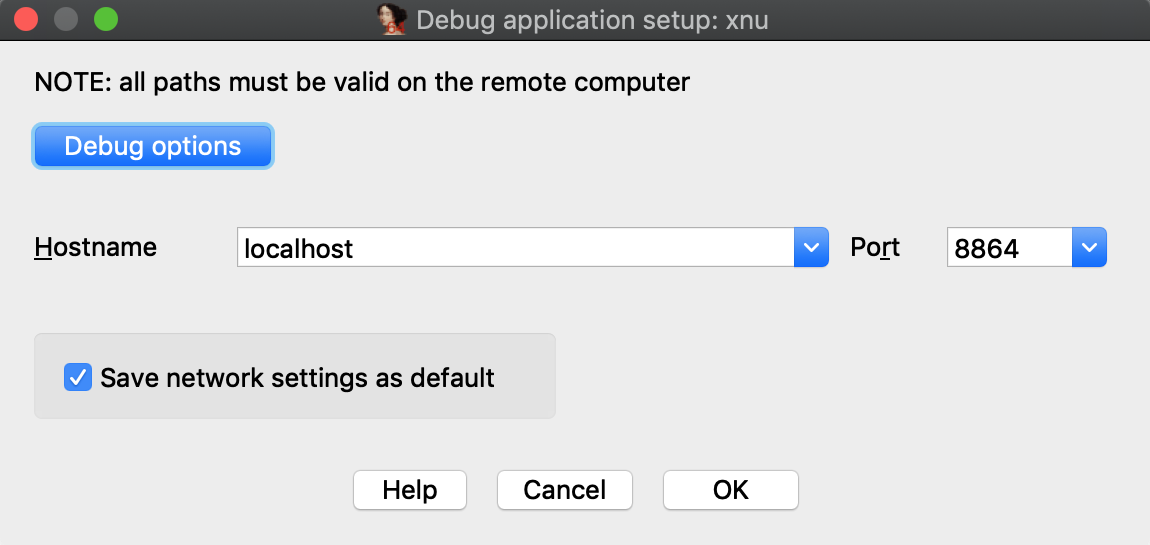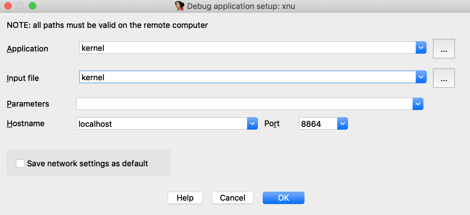 Return to IDA and use Debugger>Select debugger to select Remote XNU Debugger. Then open Debugger>Process options and set the following fields: