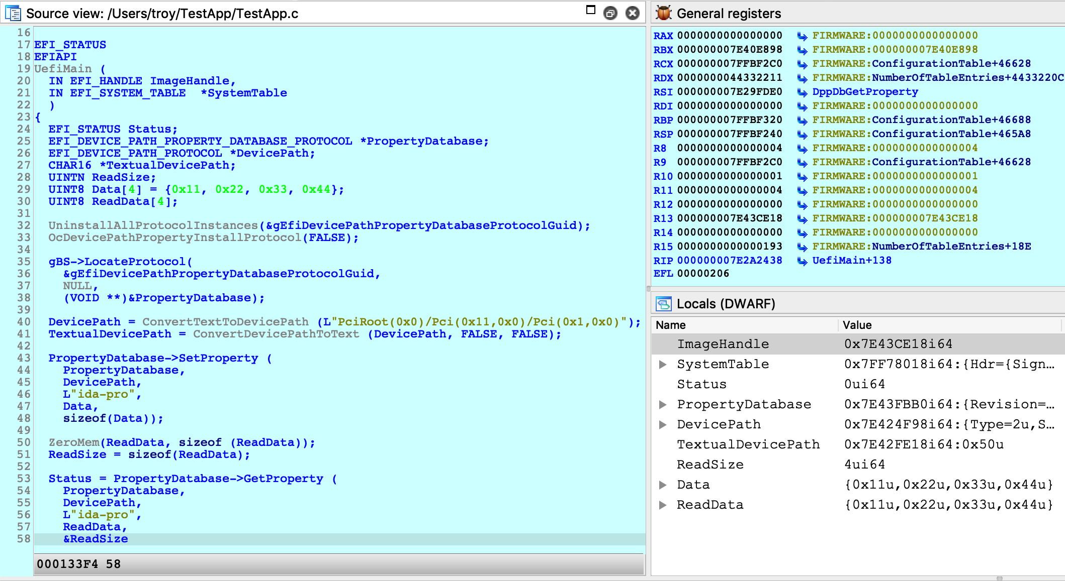 10. Resume the OS and launch TestApp from the EFI Shell prompt:Shell>fs1:\Users\vmuser\TestApp\TestApp.efiAt this point IDA will detect that the target app has been loaded, and suspend the process just before the entry point of TestApp.efi (because of step 5). 11. Now we can set a breakpoint somewhere in TestApp.efi and resume the OS. The debugger will be able to load source file and local variable information from TestApp.dll.dSYM: