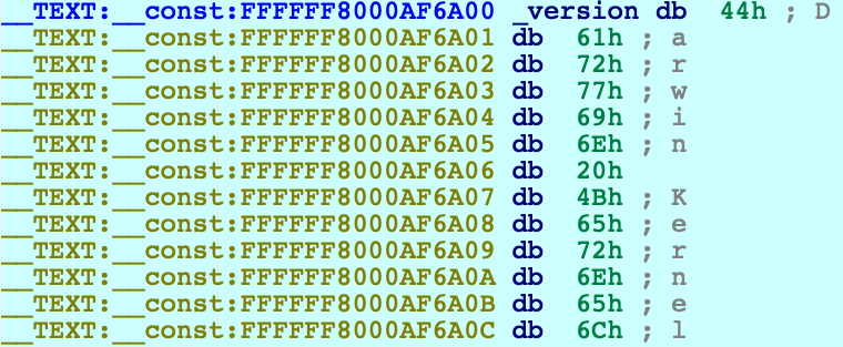 bash $ sudo nvram boot-args="slide=0 debug=0x100 keepsyms=1"3. shut down the VM and add the following line to the .vmx file:c debugStub.listen.guest64 = "TRUE"4. power on the virtual machine, open Terminal, and run this command:$ uname -v Darwin Kernel Version 17.7.0 ... root:xnu-4570.71.17~1/RELEASE_X86_64Let's use IDA to modify this version string.