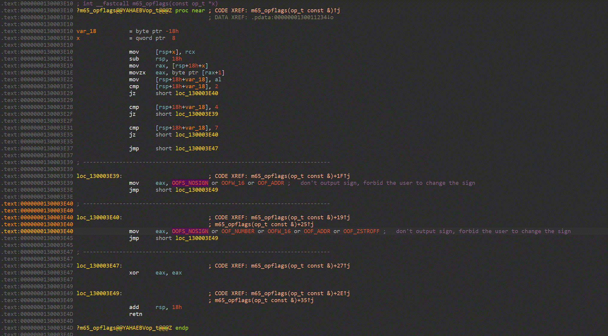 - We finally switch to the disassembly window. Through the Edit -> Operand types -> Enum member menu (or by pressing M on the second operand at addresses 0x130003E39 and 0x130003E40) we select the enum type we just defined and get this result…