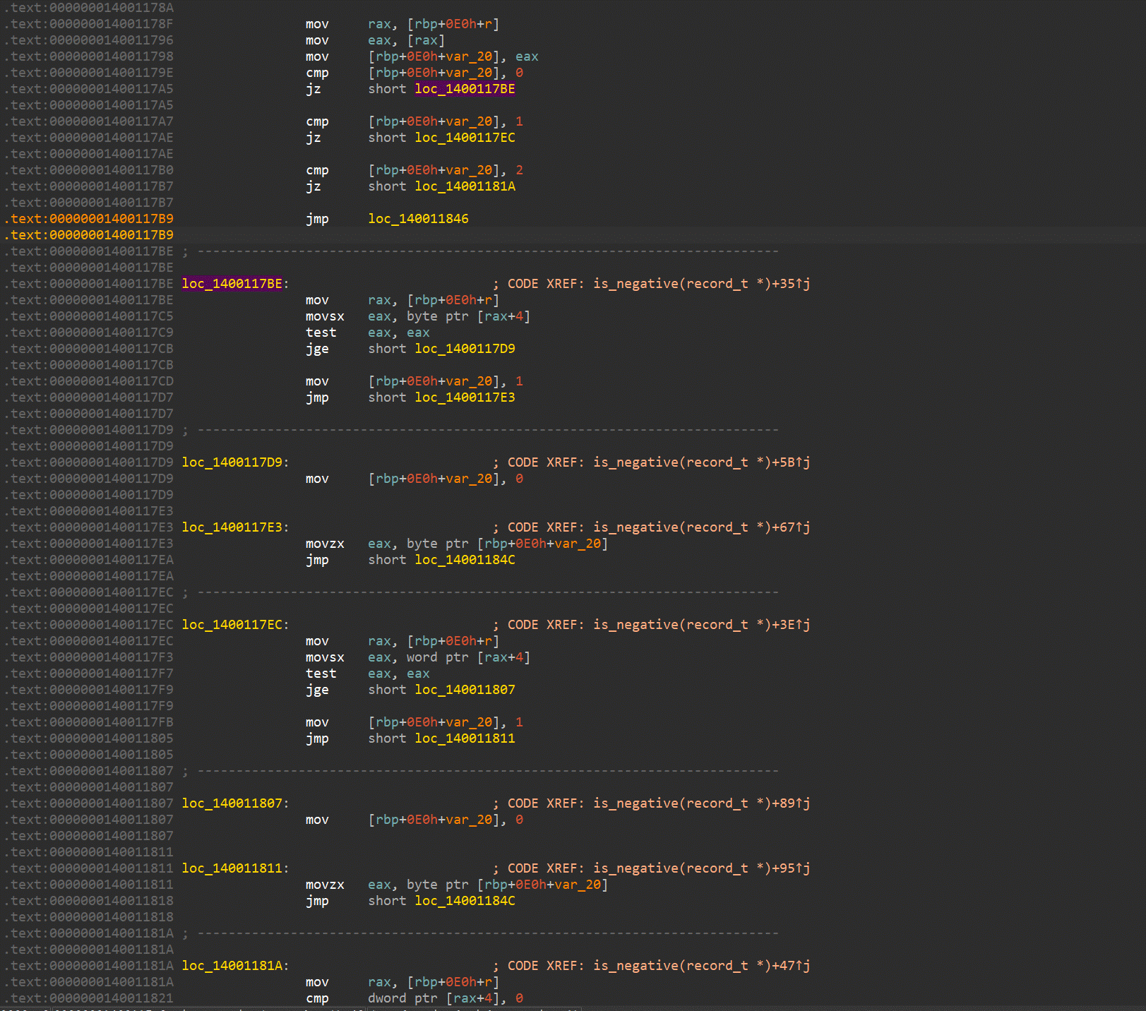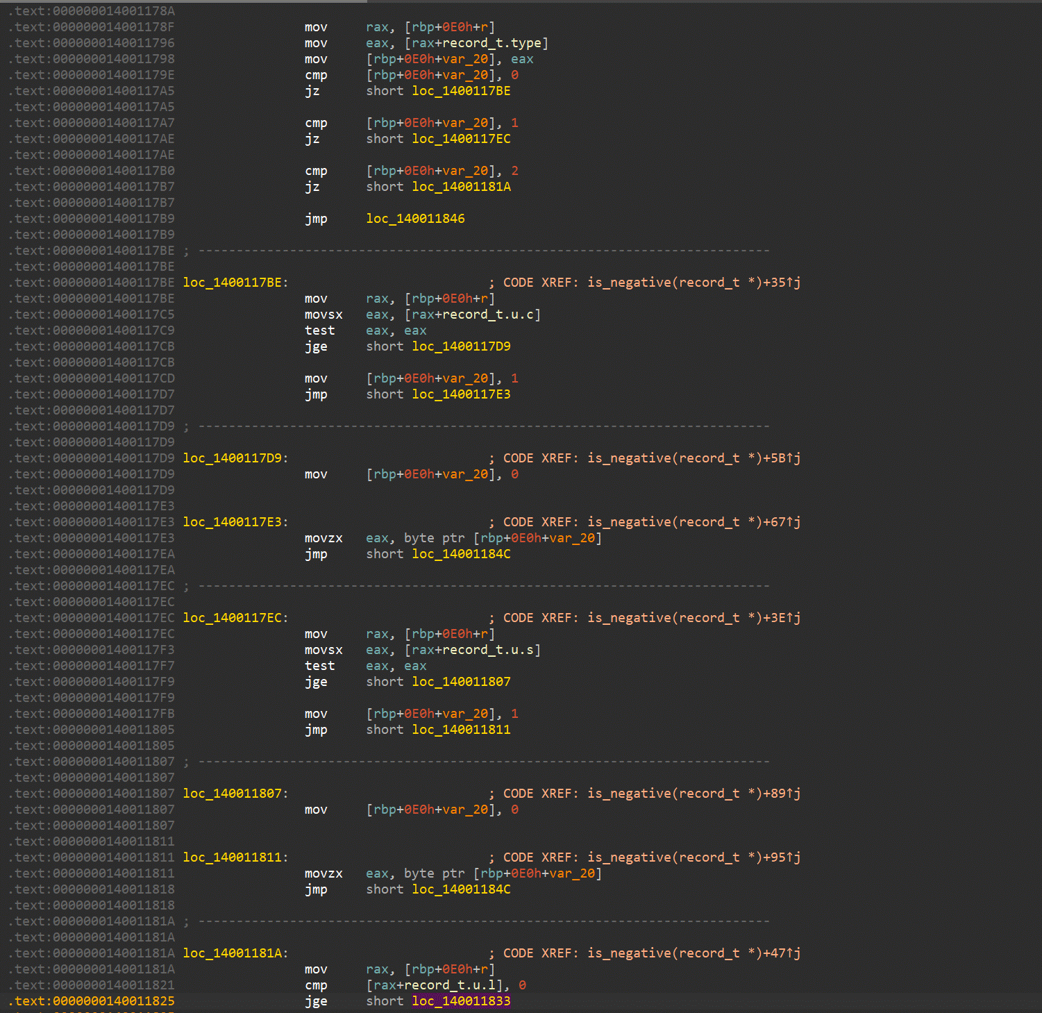 Switching to the disassembly window, we apply the defined structure through the Edit|Operand types|Struct offset menu item and select the proper representation for the operand. In the union type case, it may be necessary to select the desired union member with the Edit|Structs|Select union member command. The final disassembly looks like this:
